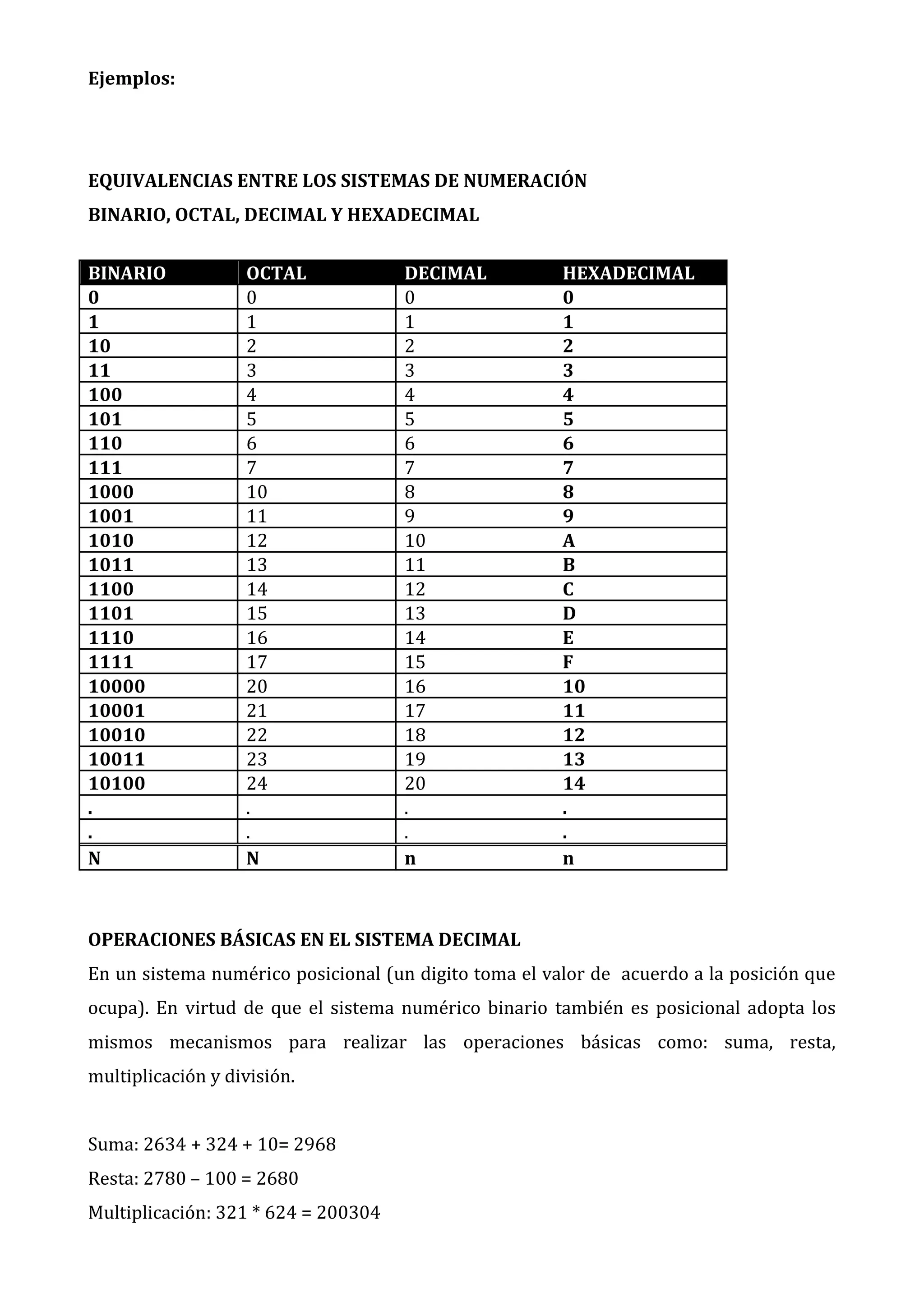 El documento describe diferentes sistemas de numeración como binario, octal, decimal y hexadecimal. Cada sistema tiene una base y conjuntos de dígitos distintos. Los sistemas de numeración son posicionales, donde el valor de cada dígito depende de su posición. También explica cómo convertir números entre estas bases usando divisiones sucesivas.