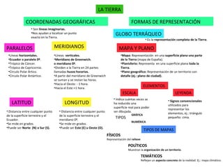 El documento describe las diferentes formas de representar la Tierra y localizar puntos en su superficie. Explica los paralelos y meridianos que dividen la Tierra, así como la latitud y longitud que miden la distancia a estos. También describe representaciones como el globo terráqueo, mapas y planos, e incluye elementos como la escala y leyenda. Finalmente, menciona diferentes tipos de mapas como físicos, políticos y temáticos.