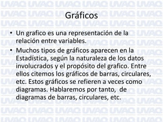 Este documento describe diferentes tipos de gráficos estadísticos y cómo representar datos cualitativos y cuantitativos. Explica diagramas de barras, circulares, pictogramas, líneas, histogramas, polígonos de frecuencias y ojivas. También incluye ejemplos y actividades para practicar la creación de estos gráficos.