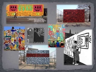 Este documento presenta a algunos de los representantes más importantes del graffiti. Comienza describiendo las raíces del graffiti en la cultura de los inmigrantes puertorriqueños y negros del Bronx. Luego introduce a Taki 183, pionero del graffiti en Nueva York, seguido de Keith Haring, conocido por sus obras de estilo pop y sus inspiraciones africanas y cubanas. También presenta a Jean-Michel Basquiat, figura emblemática de los 80 que usó el graffiti para expresar mensajes poéticos y filosóf