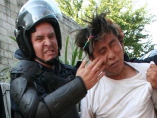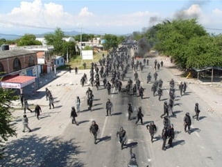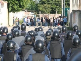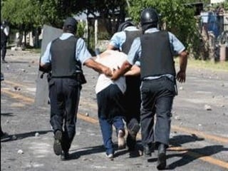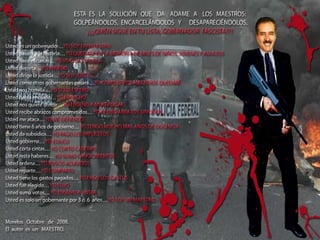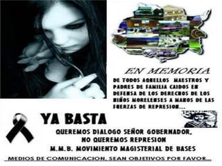 El documento describe la represión del gobierno de Morelos contra los maestros en protesta, incluyendo el uso de fuerzas militares y policiales para reprimir violentamente las manifestaciones en varios pueblos de Morelos como Amayuca y Xoxocotla, dejando muchos heridos y detenidos. A pesar de las negociaciones simuladas, el gobierno continúa la represión para imponer la reforma educativa conocida como ACE, que privatiza la educación y cierra escuelas normales, desatando la violencia del estado contra el magisterio