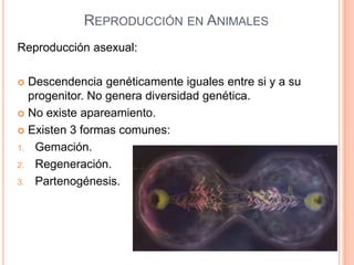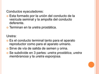 El documento describe los aparatos reproductores masculino y femenino. En el aparato masculino, los testículos producen espermatozoides a través de la espermatogénesis. Los conductos transportan los espermatozoides y las glándulas secretan el líquido seminal. En el aparato femenino, los ovarios producen óvulos a través de la ovogénesis. Las trompas de Falopio transportan los óvulos y el útero alberga el desarrollo inicial del embrión. La vagina recibe al pene durante la cópula.