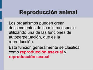 Este documento describe los diferentes tipos de reproducción en animales, incluyendo la reproducción asexual mediante bipartición, gemación y regeneración, y la reproducción sexual que implica la meiosis, fecundación y desarrollo embrionario hasta el nacimiento. También cubre temas como la gestación, metamorfosis, hermafroditismo y el celo en mamíferos.