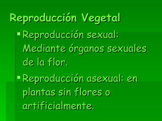 Este documento resume los principales métodos de reproducción vegetal. La reproducción sexual ocurre a través de las flores, que contienen órganos sexuales. El proceso implica la polinización, donde el polen se deposita en el pistilo, y la fecundación, donde el polen fecunda el óvulo. El fruto resultante contiene la semilla fecundada. La reproducción asexual incluye métodos como estacas, cormos, bulbos, acodos, injertos y otros, donde nuevas plantas se originan sin la necesidad de flores