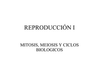 El documento describe los procesos de reproducción celular de mitosis, meiosis y ciclos biológicos. Explica que la mitosis divide el material genético entre células hijas iguales, mientras que la meiosis reduce el número de cromosomas a la mitad para producir gametos. También distingue entre reproducción asexual, que crea organismos genéticamente idénticos, y reproducción sexual, que combina material genético de dos progenitores.