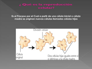 La división celular es el proceso por el cual una célula madre se divide en dos células hijas a través de la división del núcleo y el citoplasma.