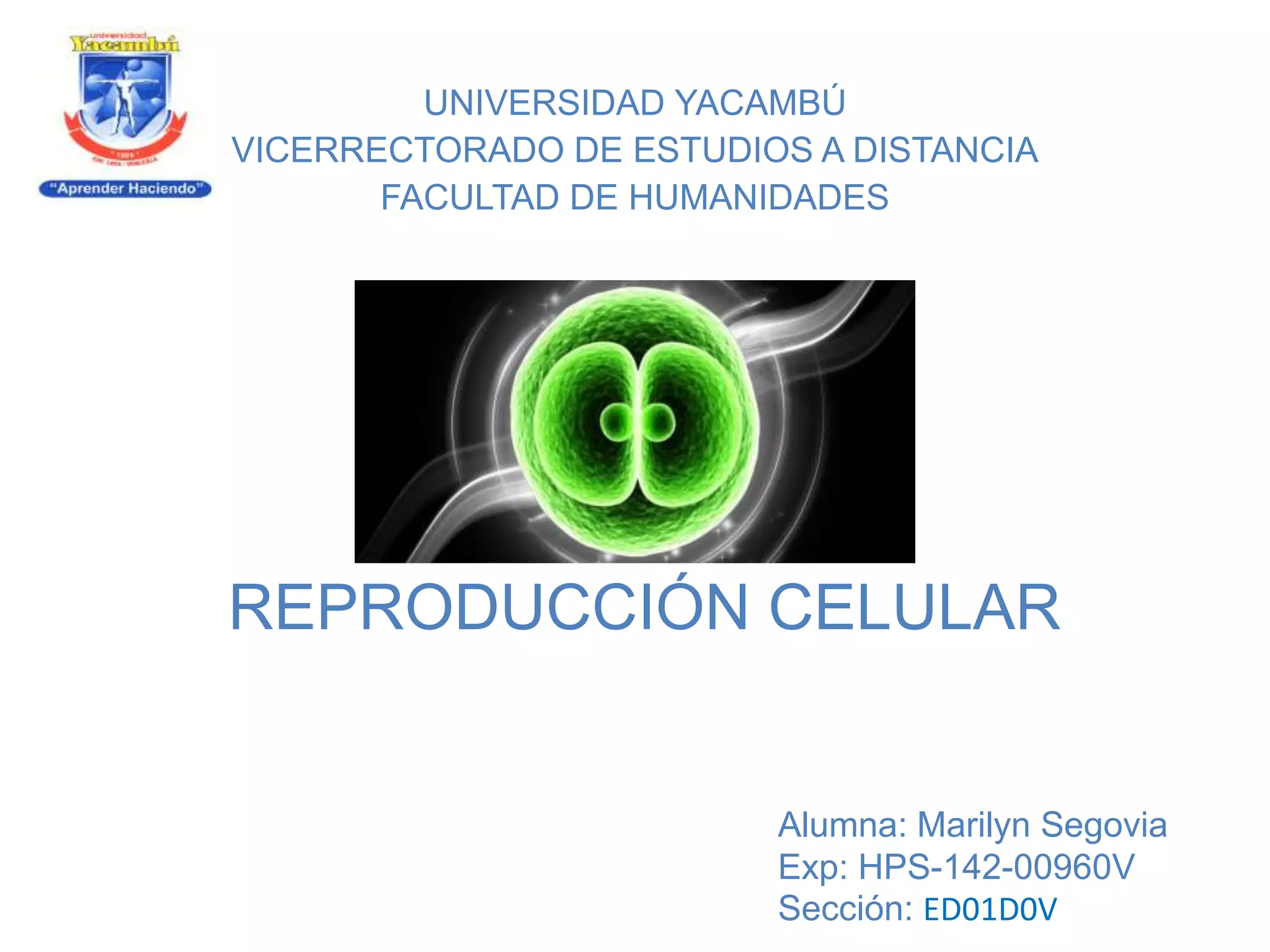 La reproducción celular asegura la renovación y reparación de células a través de la división celular. Existen dos tipos de división celular: la mitosis, que produce dos células hijas idénticas; y la meiosis, que reduce la cantidad de cromosomas a la mitad para producir gametos con número haploide de cromosomas y así asegurar la reproducción sexual.