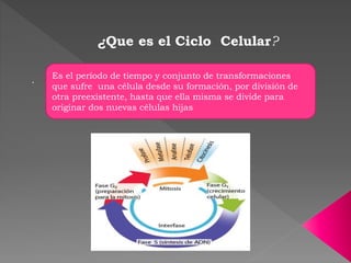 El documento describe las etapas del ciclo celular, incluyendo la interfase (G1, S, G2) y la división celular (mitosis y meiosis). Explica que la interfase es el período entre divisiones donde ocurre el crecimiento celular y replicación del ADN. La mitosis produce dos células hijas idénticas, mientras que la meiosis da como resultado células haploides como gametos para la reproducción sexual.