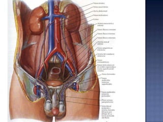 Este documento describe los órganos del sistema reproductor masculino, incluyendo los testículos, epidídimos, conductos deferentes, vesículas seminales, próstata, glándulas bulbouretrales y pene. Explica la función de cada órgano y su papel en la reproducción y producción de esperma.