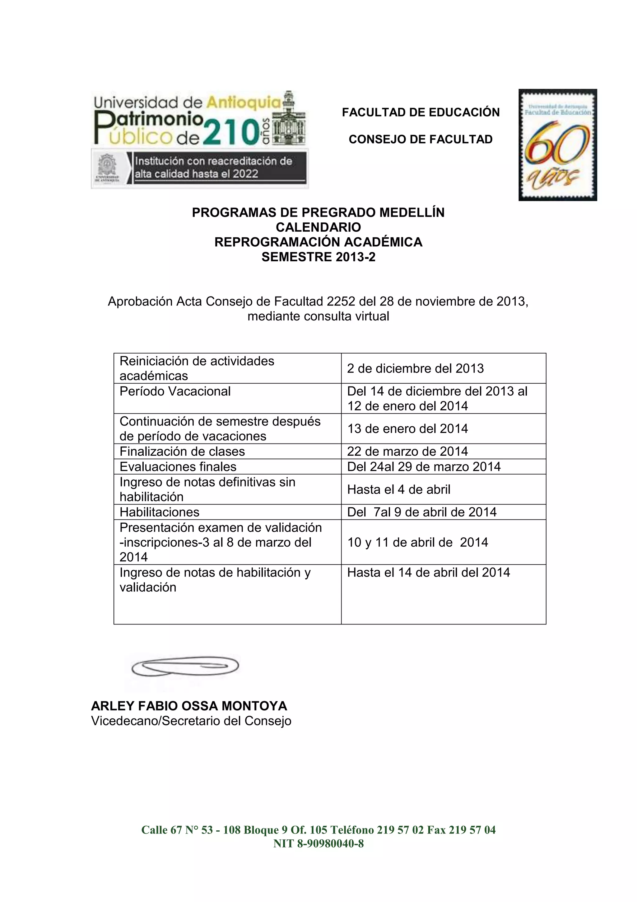 El documento presenta el calendario académico reprogramado para el semestre 2013-2 de los programas de pregrado en Medellín de la Facultad de Educación, debido a la decisión de levantar el paro estudiantil. El calendario incluye fechas para el reinicio de clases, período vacacional, finalización de clases y exámenes finales. Además, se informa que los cursos que pudieron continuar durante el paro finalizarán según el calendario original y los que no podrán hacerlo seguirán el calend