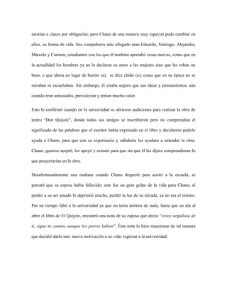 La película cuenta la historia de Chano, un hombre de 70 años que decide estudiar la carrera de literatura hispana en la universidad. Aunque su esposa dudaba de su idea al principio, termina apoyándolo. En la universidad, Chano se hace amigo de sus compañeros a pesar de su edad, y los ayuda a entender una obra de teatro con su experiencia. Desafortunadamente, la esposa de Chano fallece, lo que lo deprimió y hizo que dejara de asistir a clases por un tiempo. Sin embargo,