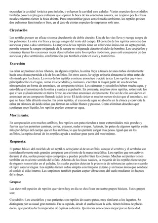 Este documento resume las principales características de los reptiles. Los reptiles se adaptaron exitosamente a la vida terrestre gracias a su piel escamosa resistente y otros rasgos como pulmones desarrollados y huevos con cáscara. Controlan su temperatura corporal cambiando de lugar y se alimentan de una gran variedad de presas que capturan de diferentes formas. Los reptiles modernos se clasifican en cuatro grupos: cocodrilos, lagartos y serpientes, tortugas y tuatara.