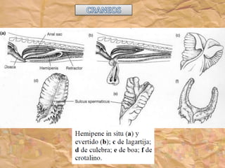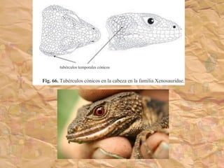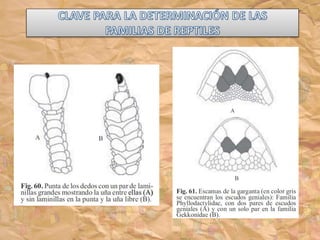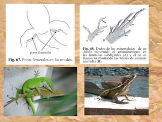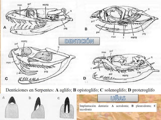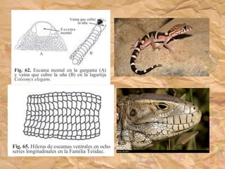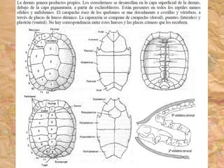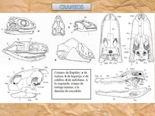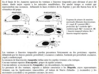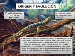 Los ancestros de los reptiles adquirieron la condición de amniota, lo que les permitió poner huevos en tierra con membranas protectoras y eliminar la etapa larvaria. El reptil más antiguo conocido data del Carbonífero Superior hace 300 millones de años. Los reptiles presentan características como escamas en la piel, desarrollo de uñas, y partición del tronco arterial.