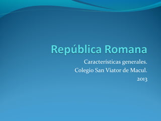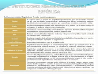 El documento resume aspectos clave de la sociedad y el gobierno de la antigua Roma desde su fundación hasta el establecimiento del Imperio Romano. Inicialmente Roma era una monarquía gobernada por reyes, luego se estableció una república con un sistema de magistrados, el Senado y asambleas ciudadanas que compartían el poder. Con las conquistas, Roma se expandió por el Mediterráneo y adoptó elementos culturales de otros pueblos, difundiendo el latín. Finalmente emergió el Imperio bajo el poder absoluto