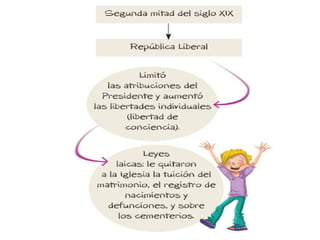 Este documento describe el período de la República Liberal en Chile entre 1861 y 1891. Hubo enfrentamientos con países vecinos que aumentaron el nacionalismo chileno. También se buscó separar la iglesia del estado. Notables presidentes incluyeron a José Joaquín Pérez, Federico Errázuriz Zañartu y Manuel Balmaceda. Chile se expandió territorialmente y se involucró en la Guerra del Pacífico. Se promulgaron leyes laicas importantes y se realizaron obras públicas durante este período.