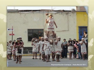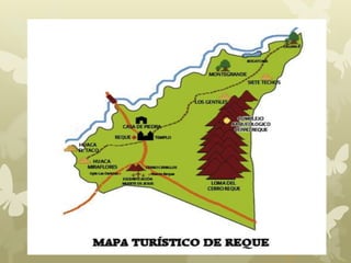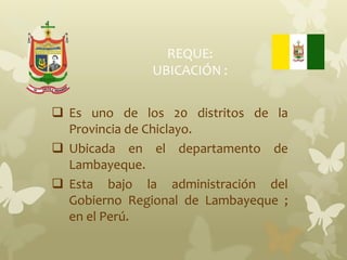 El documento describe la historia, cultura y geografía del distrito de Reque, ubicado en la provincia de Chiclayo, Perú, resaltando su importancia histórica y turística desde épocas preincaicas hasta su creación como distrito en el siglo XIX. Además, se mencionan sus características geográficas, climáticas y la diversidad cultural de su población, así como los sitios turísticos destacados como el complejo arqueológico 'Siete Techos'. Se incluye información sobre la economía local, las tradiciones y las celebraciones culturales que mantienen vivas las raíces de Reque.