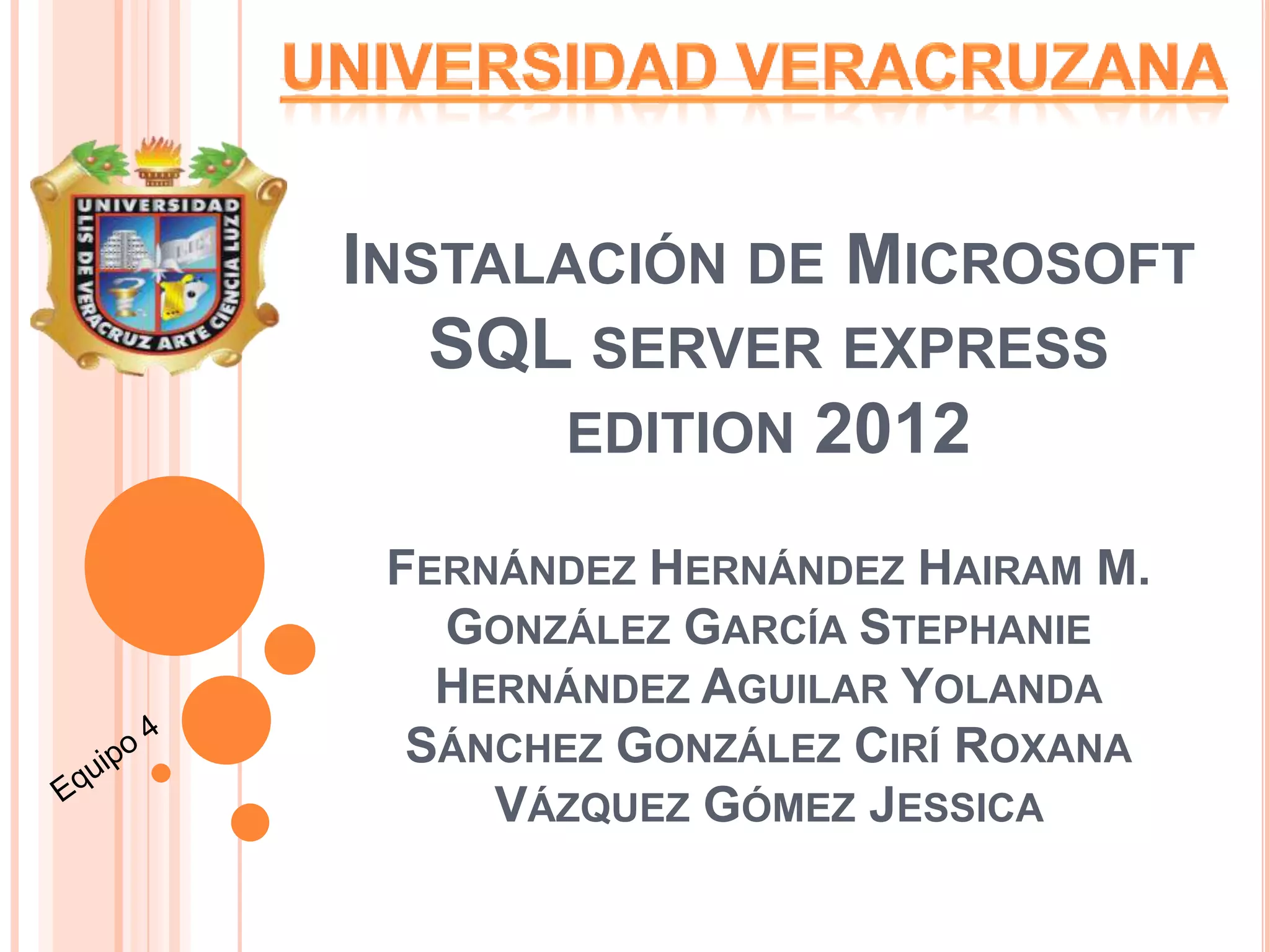 Este documento proporciona información sobre la instalación de Microsoft SQL Server Express Edition 2012. Detalla la historia de versiones de SQL Server, las desventajas de SQL Server, los requisitos generales, hardware y software necesarios e información sobre el espacio en disco requerido para los diferentes componentes de SQL Server 2012.