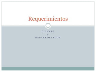 Este documento describe la diferencia entre los requerimientos del cliente y los requerimientos del desarrollador. Explica que los requerimientos del cliente se expresan en lenguaje natural y se enfocan en lo que el usuario desea, mientras que los requerimientos del desarrollador son más técnicos y detallados, describiendo cómo debe funcionar el sistema internamente. También señala algunos errores comunes a evitar en la expresión de requerimientos del cliente.