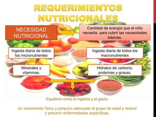 Este documento presenta información sobre los requerimientos nutricionales de niños y adolescentes en diferentes etapas de desarrollo. Detalla las necesidades energéticas, de proteínas, calcio, hierro y otros nutrientes para bebés, niños preescolares, escolares, adolescentes y personas mayores. Además, ofrece recomendaciones sobre la distribución de macronutrientes y comidas a lo largo del día.
