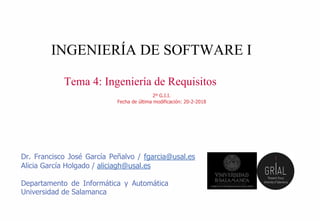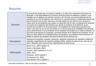 Este documento trata sobre la ingeniería de requisitos. Explica que la ingeniería de requisitos es el punto de partida más importante de un proyecto de software y que una mala captura de los requisitos puede causar muchos problemas. Describe el proceso de ingeniería de requisitos, incluyendo la obtención, análisis, verificación y validación de requisitos. También cubre conceptos clave como los requisitos funcionales y no funcionales.