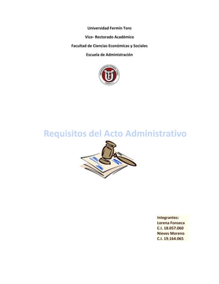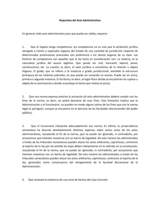 El documento describe los requisitos generales para que un acto administrativo sea válido. Estos incluyen que (1) el órgano tenga competencia sobre la materia, cuantía, grado y territorio del asunto; (2) una norma expresa autorice la actuación y el funcionario la interprete adecuadamente; y (3) se constate la existencia de hechos del caso concreto que concuerden con la norma. De esta forma, se asegura que la actuación administrativa no sea arbitraria y se ajuste a la legalidad.