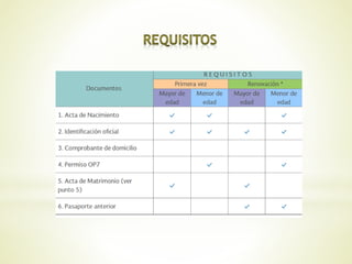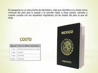 El pasaporte es un documento de identidad y viaje que identifica la nacionalidad de una persona y le permite viajar a otros países si cumple con los requisitos migratorios. Para renovar un pasaporte expedido antes de 1995 o en oficinas consulares antes de 2006, se requiere realizar el trámite como si fuera la primera vez y presentar los documentos originales. Cuando un menor viaja sin ambos padres, uno de los padres debe autorizar el pasaporte en el consulado más cercano mediante un formulario y este será enviado al consulado correspondiente