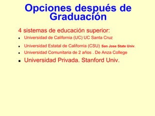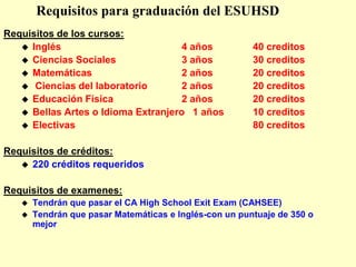 Este documento resume los requisitos de graduación y cursos requeridos para graduarse de la escuela secundaria ESUHSD. Los estudiantes necesitan completar 220 créditos que incluyen 4 años de inglés, 3 años de ciencias sociales, 2 años de matemáticas y ciencias, y 2 años de educación física. También deben pasar el examen de egreso de la escuela secundaria de California y los exámenes de matemáticas e inglés con una puntuación de al menos 350. El documento también describe las opciones universitarias dispon