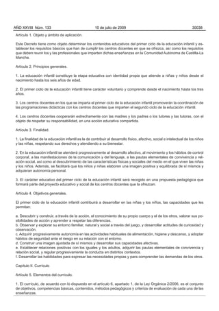 Este documento establece los contenidos educativos del primer ciclo de la educación infantil (desde el nacimiento hasta los 3 años) en la región de Castilla-La Mancha, España. Define las áreas curriculares, competencias básicas, objetivos y criterios de evaluación. También establece los requisitos que deben cumplir los centros y profesionales que imparten esta etapa educativa. El objetivo es contribuir al desarrollo integral de los niños pequeños a través de un enfoque global e integral que involucre a las familias