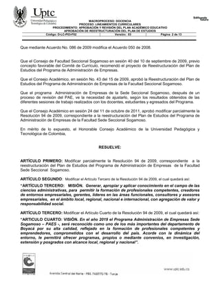 Este documento presenta una resolución que modifica parcialmente una resolución anterior relacionada con la reestructuración del plan de estudios del programa de Administración de Empresas de la Facultad Sede Seccional Sogamoso. Se modifican los artículos tercero, cuarto, octavo y décimo primero para actualizar la misión, visión, competencias y estructura curricular del programa.