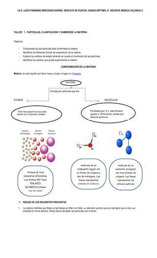 Este documento presenta cuatro actividades para recuperar puntos en química para séptimo grado. Incluye un taller sobre partículas y clasificación de la materia, propiedades de la materia, un laboratorio sobre un supermercado y un taller de habilidades científicas. Las estudiantes deben resolver las actividades a mano y entregarlas en una carpeta antes de la fecha límite de rescate de puntos establecida por el colegio.