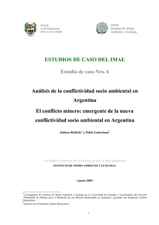 Este documento analiza los conflictos socioambientales en Argentina, enfocándose en los conflictos mineros. Explica que estos conflictos surgen del modelo insostenible de desarrollo basado en la explotación de recursos naturales. Los conflictos mineros se han incrementado con el crecimiento de la inversión minera y toman diferentes formas relacionadas con lo ambiental, socioeconómico y el marco normativo. Para abordar estos conflictos de manera democrática y transformarlos, se necesita entender su complejidad y dinámica evolutiva,