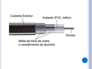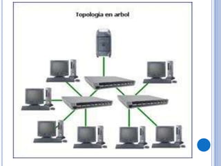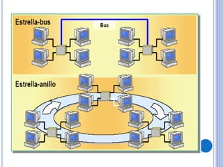Este documento proporciona información sobre los tipos de redes, topologías de redes y medios de transmisión. Explica que una red es un conjunto de equipos conectados para compartir información y recursos. Describe las redes locales (LAN), de área amplia (WAN), de campus (CAN) y metropolitanas (MAN), así como las topologías en bus, anillo, estrella y híbridas. Finalmente, detalla los medios de transmisión guiados como el par trenzado, cable coaxial y fibra óptica.