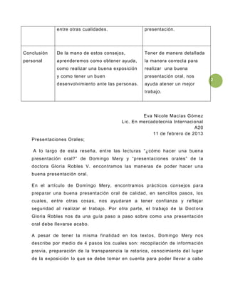 Este documento resume dos lecturas sobre cómo realizar presentaciones orales de manera efectiva. La primera lectura de Mery Domingo proporciona consejos prácticos en cuatro pasos para preparar una presentación oral de calidad, incluyendo recopilar información, preparar transparencias y conocer el lugar. La segunda lectura de Gloria Robles ofrece una guía detallada en tres etapas de planificación, realización y evaluación. Ambas lecturas concluyen que siguiendo sus consejos se puede lograr una buena presentación oral y ganar confianza al
