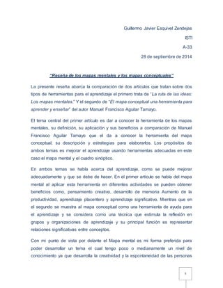 Este documento resume y compara dos artículos sobre mapas mentales y mapas conceptuales como herramientas de aprendizaje. Explica que los mapas mentales se enfocan en desarrollar la creatividad mientras que los mapas conceptuales proveen una vista más detallada de las relaciones entre conceptos. Ambos son útiles para mejorar la organización de información y estimular un aprendizaje significativo. El autor concluye que tanto los mapas mentales como los mapas conceptuales son valiosas herramientas para estudiantes.