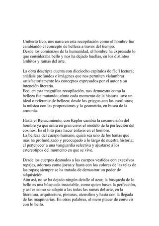 Umberto Eco explora cómo el concepto de belleza ha cambiado a través de la historia en su libro Historia de la Belleza. Desde la antigüedad griega, cuando la belleza se encontraba en la perfección de las formas humanas y naturales, hasta el Renacimiento, cuando el foco cambió al ser humano. La belleza también ha estado influenciada por factores como la moda, la publicidad y los medios masivos, haciendo que sea un concepto más relativo en la actualidad.