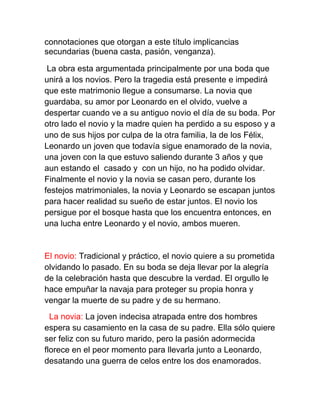 La obra Bodas de Sangre, escrita por el español Federico García Lorca en 1932, trata sobre una boda frustrada debido al amor prohibido entre la novia y su ex novio Leonardo. Durante la celebración de la boda, la novia huye con Leonardo desatando la ira del novio, quien los persigue y mata a ambos amantes en el bosque. La obra explora temas como la pasión, los celos y el destino trágico a través de sus personajes atormentados.