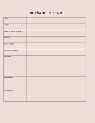 Este documento proporciona información básica sobre un cuento, incluyendo su título, autor, lugar de origen, editorial, fecha de edición y número de páginas. Además, ofrece un breve resumen de la trama y comentarios finales.