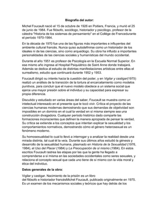 Michel Foucault analiza en su obra "El examen" las relaciones entre el saber y el poder y cómo el examen permite calificar, clasificar y castigar a los individuos, transformándolos en objetos descriptibles. La prisión surge en el siglo XIX como una institución necesaria para controlar las formas de ilegalismo a través de mecanismos de vigilancia, control y corrección sobre los presos. Aunque la prisión no era nueva, se impuso como castigo universal debido a ventajas como la cuantificación exacta de la pena a través del