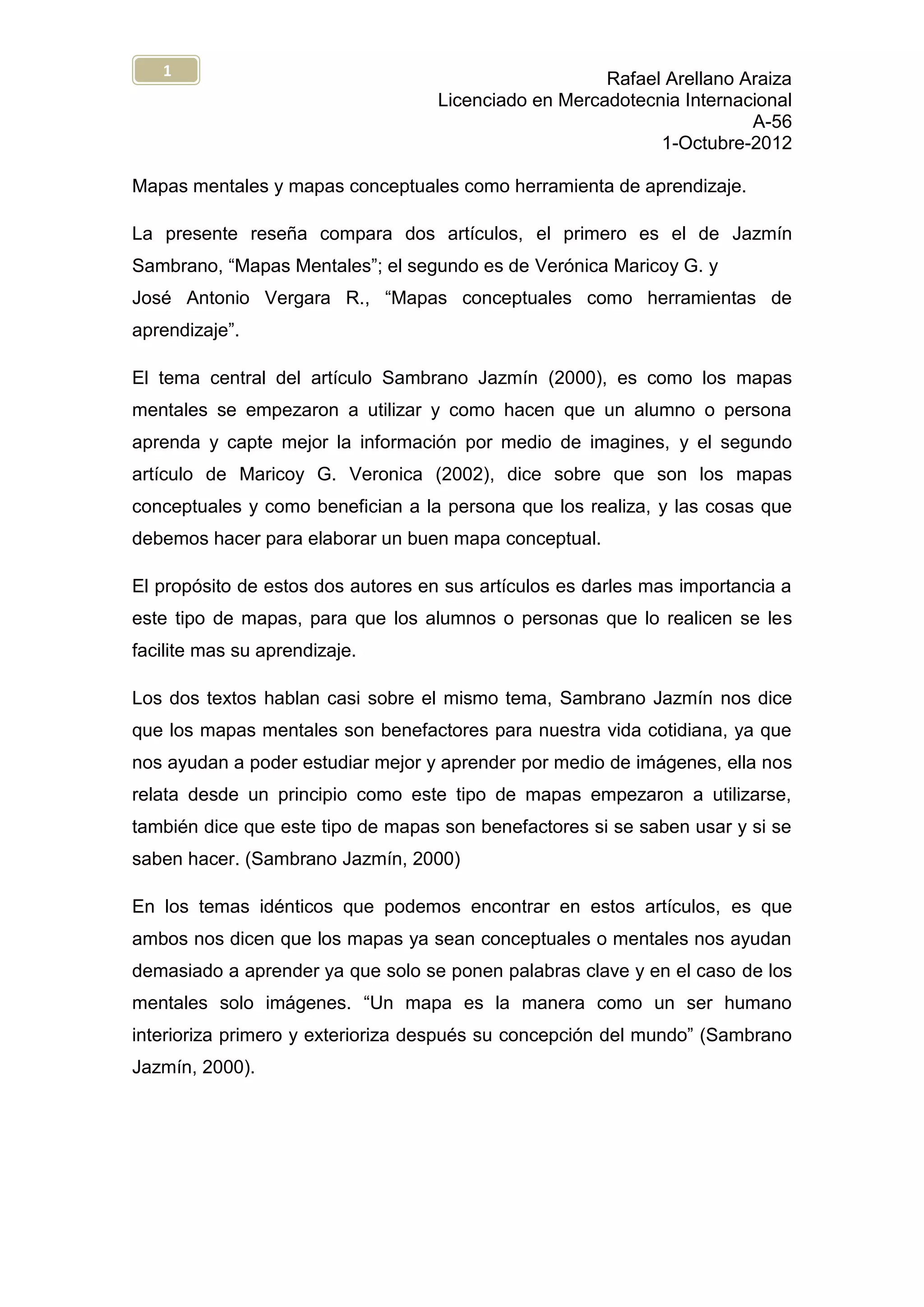 Este documento resume y compara dos artículos sobre mapas mentales y mapas conceptuales como herramientas de aprendizaje. Ambos artículos argumentan que los mapas, ya sea mentales o conceptuales, mejoran la capacidad de aprendizaje de una persona al permitirles organizar información clave de manera visual. El autor concluye que tanto los mapas mentales como los conceptuales son útiles para que el cerebro procese la información de manera más efectiva.