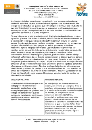 Este documento habla sobre la formación de maestros. Explica que la formación docente comienza desde la educación básica y continúa en las escuelas normales, donde los estudiantes adquieren conocimientos teóricos, metodológicos y didácticos para ejercer la docencia. También señala que en las escuelas normales, los estudiantes aprenden el oficio de ser alumnos y maestros a través de rituales y prácticas. Finalmente, menciona que las instituciones educativas promueven valores,