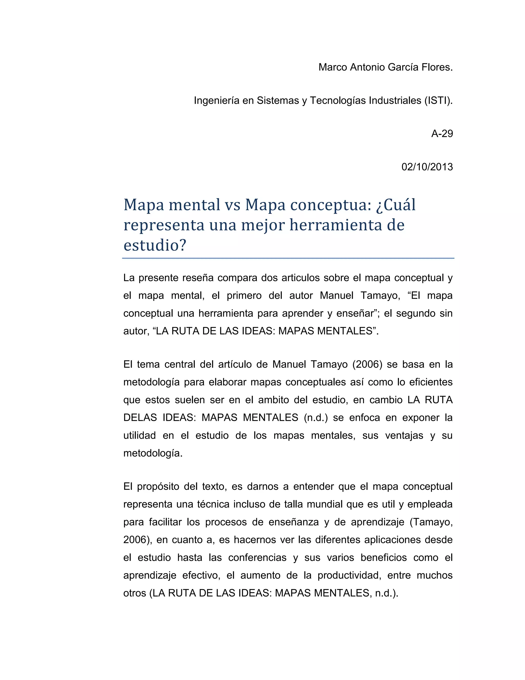 Este documento compara los mapas conceptuales y los mapas mentales como herramientas de estudio. Explica que los mapas conceptuales son más fáciles de comprender ya que pueden ser utilizados por el creador y otras personas, mientras que los mapas mentales salen de la imaginación individual. Ambos métodos mejoran habilidades como la memoria y la comprensión, aunque los mapas mentales también presentan desventajas si no se usan correctamente. El autor concluye que tanto los mapas conceptuales como los mentales son útiles para el estudio.