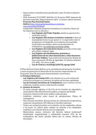 El documento presenta resúmenes de varias presentaciones realizadas en un evento sobre perspectivas económicas y laborales en Venezuela. Se discuten temas como las recientes reformas legales, el Plan Nacional Simón Bolívar, perspectivas macroeconómicas, y cómo la población venezolana percibe la situación económica y su futuro. También se comparten resultados de encuestas sobre el apoyo a programas sociales y la opinión sobre conceptos como socialismo y democracia.