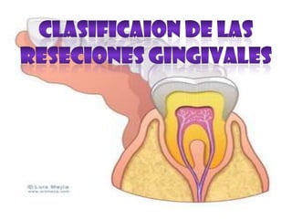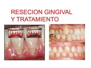Este documento describe diferentes tipos y causas de recesión gingival, así como tratamientos quirúrgicos como colgajos y injertos para cubrir raíces expuestas. Se explican técnicas como colgajos rotacionales, desplazados o combinados con membranas, así como injertos libres epitelizados o de tejido conjuntivo para recubrir raíces y aumentar la encía adherida. El objetivo es lograr una cobertura estable y prevenir futuras recesiones.