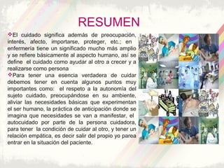 El cuidado en enfermería va más allá de la preocupación y aboga por el desarrollo humano, implicando la autonomía del paciente y la empatía del cuidador. Se enfatiza la importancia de anticipar las necesidades y el autocuidado del profesional para poder brindar un cuidado efectivo y significativo. En conclusión, el cuidado es vital para la supervivencia y el bienestar, constituyendo una función esencial en la enfermería.