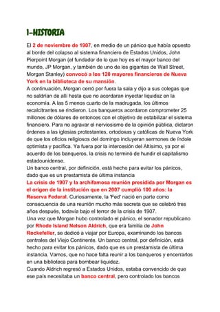 La Reserva Federal de los Estados Unidos es el banco central del país. Se creó en 1913 como resultado de una reunión secreta celebrada años antes entre banqueros privados y políticos. Su objetivo principal es lograr el pleno empleo, la estabilidad de precios y tipos de interés moderados a largo plazo. Para ello utiliza diversas herramientas de política monetaria como las operaciones de mercado abierto.