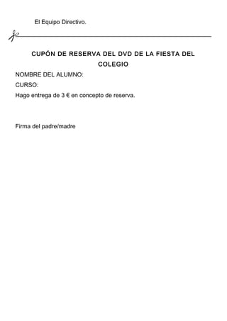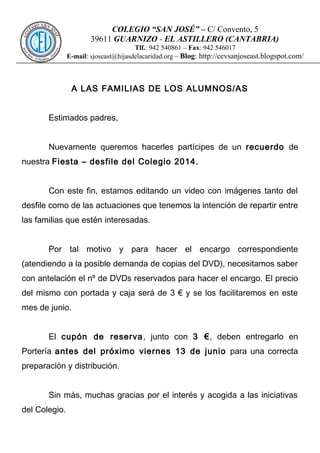 El Colegio "San José" está editando un video con imágenes de su desfile y actuaciones de la Fiesta del Colegio 2014 y lo distribuirá en DVD a las familias interesadas. Solicitan a los padres que reserven copias antes del 13 de junio entregando 3 euros y el cupón de reserva en portería, para poder hacer el pedido de DVDs con antelación y distribuirlos en junio.