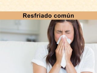 El documento trata sobre el resfriado común. Explica que es una infección viral frecuente del tracto respiratorio superior causada principalmente por rinovirus y coronavirus. Describe los síntomas como fiebre, dolor de cabeza, congestión nasal y estornudos. No existe un tratamiento específico, solo se usan analgésicos y antipiréticos para aliviar los síntomas. La mejor forma de prevenirlos es mantener una buena higiene y un sistema inmunológico fuerte.