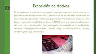 Este documento describe los cambios propuestos al Régimen Simplificado de Confianza (RESICO) para personas físicas en México. Se propone simplificar los trámites y pagos del impuesto sobre la renta para contribuyentes con ingresos menores, así como establecer tasas más bajas. También se incluiría de forma automática al sector primario en RESICO y se otorgarían exenciones para ingresos menores a $900,000 pesos. Finalmente, se establecen las obligaciones de los contribuyentes bajo este nuevo régimen.