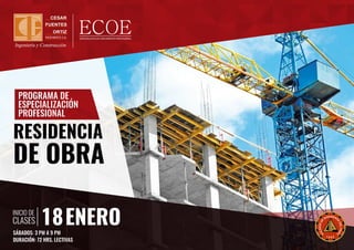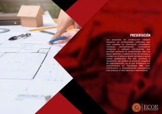 Este documento describe un programa de especialización de 72 horas sobre temas de construcción como BIM, Lean Construction, sistemas constructivos y gestión de proyectos. El programa se llevará a cabo los sábados de 3 a 9 pm en el Colegio de Ingenieros del Perú y está dirigido a profesionales, empresas constructoras y público interesado en la industria de la construcción.