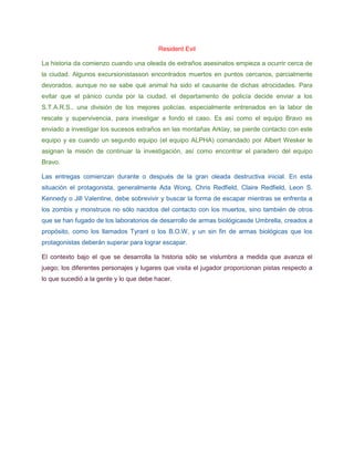 El juego Resident Evil comienza cuando una serie de extraños asesinatos ocurren cerca de una ciudad. El departamento de policía envía al equipo S.T.A.R.S. a investigar, pero pierden contacto con el Equipo Bravo. El Equipo Alfa, liderado por Albert Wesker, es enviado a buscar al Equipo Bravo y continuar la investigación. Los protagonistas como Chris Redfield, Jill Valentine o Leon S. Kennedy deben sobrevivir y escapar de zombis y monstruos creados por la compañía Umbrella mientras descubren pistas